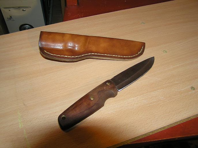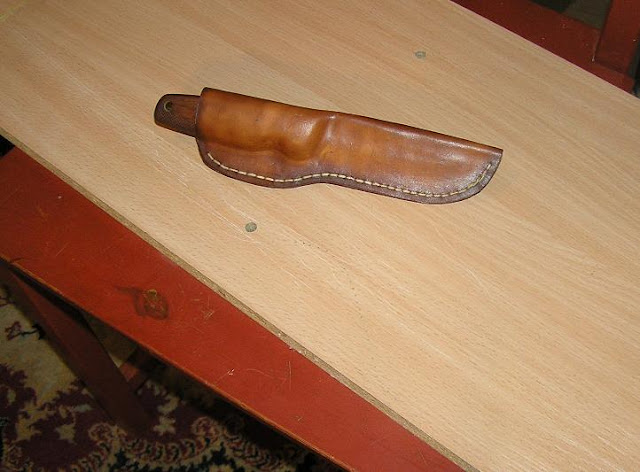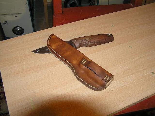 Przeglądając forum dla nożorobów, oraz prace kolegów z forum survivalowego, postanowiłem popełnić pochewkę dla mojego noża. Nigdy wcześniej nie robiłem nic podobnego więc długo w myślach rozważałem cały projekt, krok po kroku Po zasięgnięciu języka zakupiłem skórę o grubości 2mm, wosk pszczeli, oraz Slam 1mm ( gruba woskowana nić ). Prace polegały na namoczeniu skóry, uzyskaniu trwałego kształtu noża, przycięciu skóry, zszyciu i nawoskowaniu. Efekt miło mnie zaskoczył.
